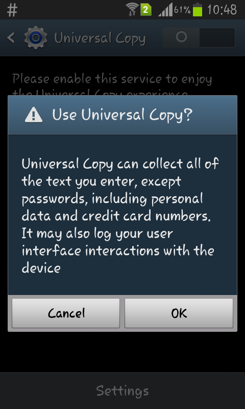 Step 2: Open the app Universal Copy and turn on the accessibility for this app. You need to grant a permission to this app so that it can read all the text that you type. Do not worry as it doesn’t collect your passwords. So, the first time when you open this app, you will get an option to turn it on. Click Ok when you see the following screen.