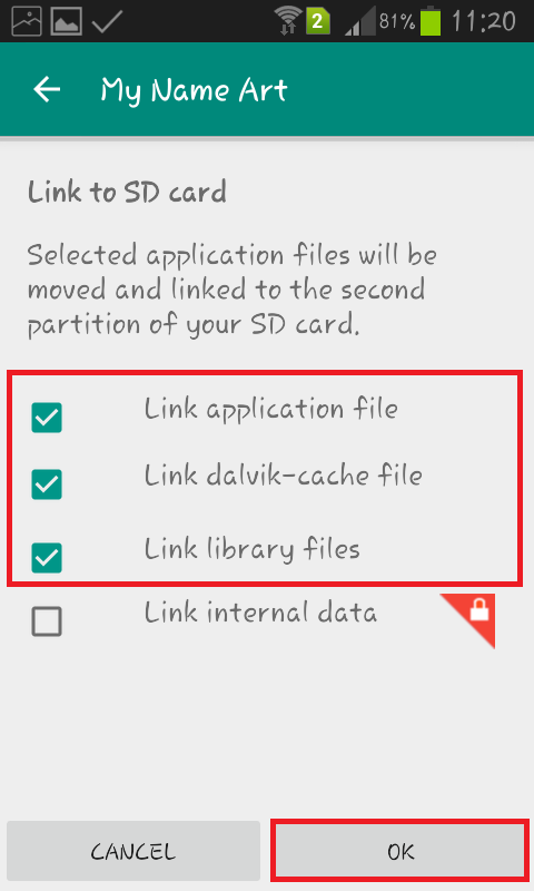 Step 14: Click OK. This will link the application files and move it to the second partition of your SD card. That’s it.