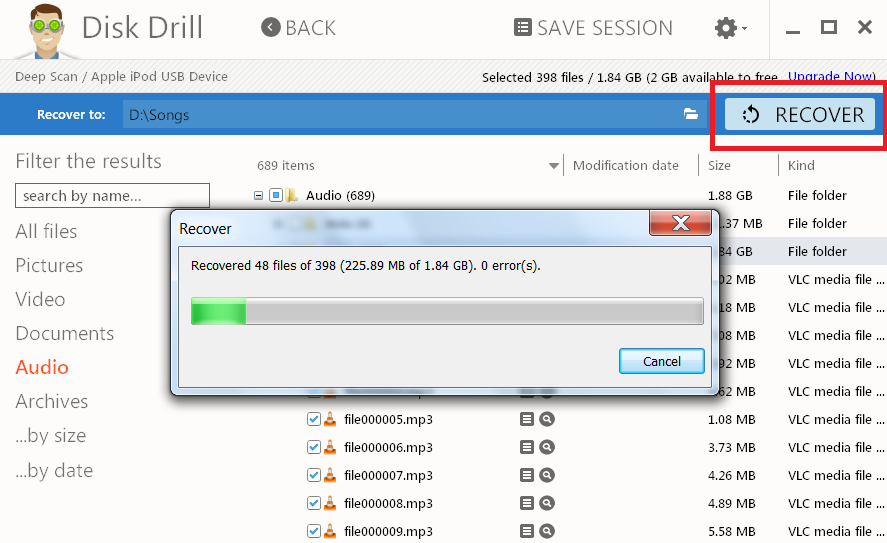 Step 7: Press Recover and it will recover all the music files in the folder that you choose above.