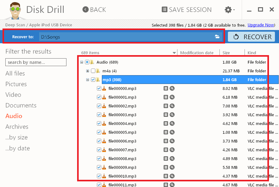 ipod audio files recovery using disk drillStep 6: Select the music files that you want to recover and choose folder location using recover to option.