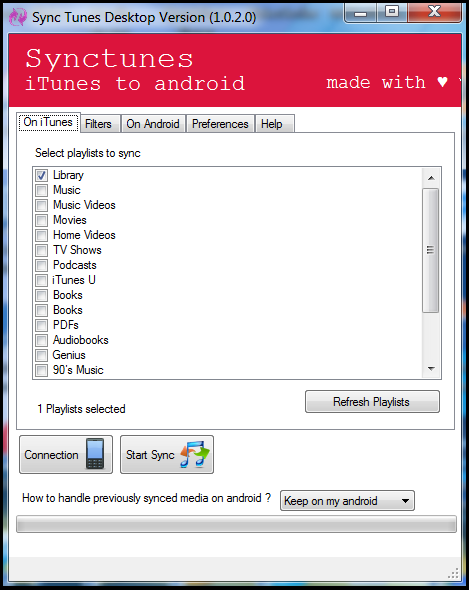 Step 4: Press connect and select the playlists to sync. Select library to sync iTunes library.
