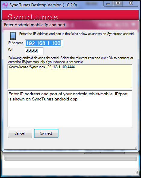 Step 3: Open Synctunes on desktop and enter IP address and port as shown on Android app.