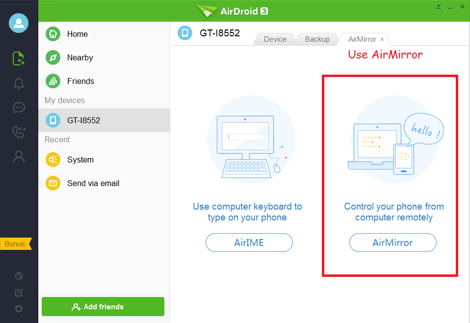 using airmirror on airdroid desktop application