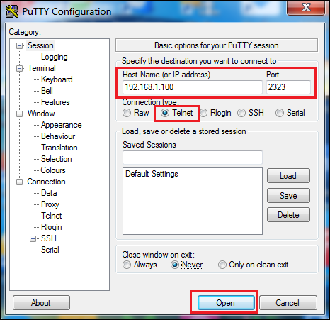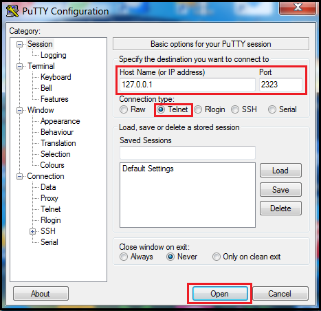Step 7: Select the connection type as telnet and open the session.