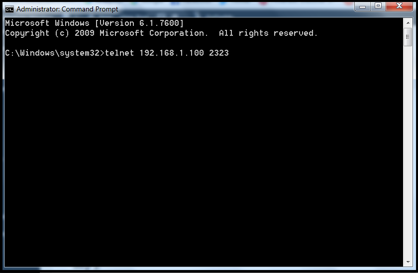 Step 3: Run command prompt as an administrator. Type telnet followed by the IP and port 2323 as shown in the app. Hit enter.