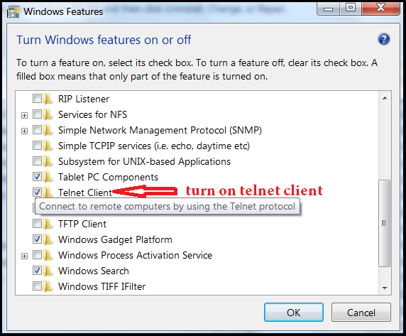 Step 1: Turn on the Telnet Client on Windows. Go to control panel>pragrams and features>Turn Windows features on or off>Telnet Client.